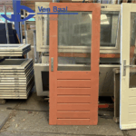 Gebruikte houten buitendeur van 82 cm breed en 201,5 cm hoog, voorzien van een groot glaspaneel met enkel glas en horizontale lamellen in het onderste deel. Deur is oranje geverfd en heeft een bestaand slotgat. Geschikt voor gebruik als schuurdeur, achterdeur of bergingsdeur.