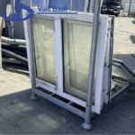 Wit kunststof raam met een afmeting van 130 cm breed en 115 cm hoog. Het linker raamdeel is voorzien van een draaikiepbeslag voor ventilatie en toegang. Het rechter raam is een vast glasdeel. Voorzien van dubbel glas en geschikt voor hergebruik in bouw- of renovatieprojecten.