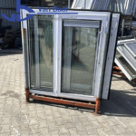 Wit kunststof draaikiepraam met een afmeting van 150 cm breed en 150 cm hoog. Het raam is voorzien van een draaikiepbeslag en een geïntegreerd dauwluchtrooster voor natuurlijke ventilatie. Geschikt voor gebruik in gevels, tuinkamers of renovatieprojecten.